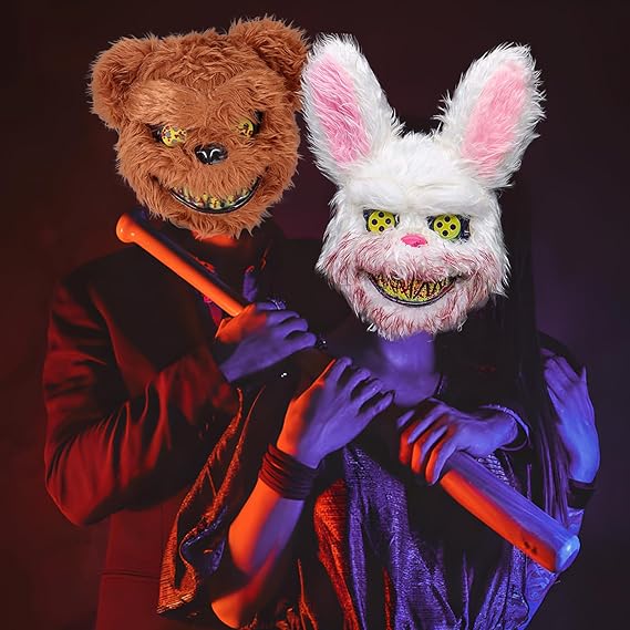 Estas dos máscaras no son simples disfraces. Son personajes. El oso salvaje y el conejo perturbador están diseñados para robar miradas, provocar escalofríos y dejar huella.